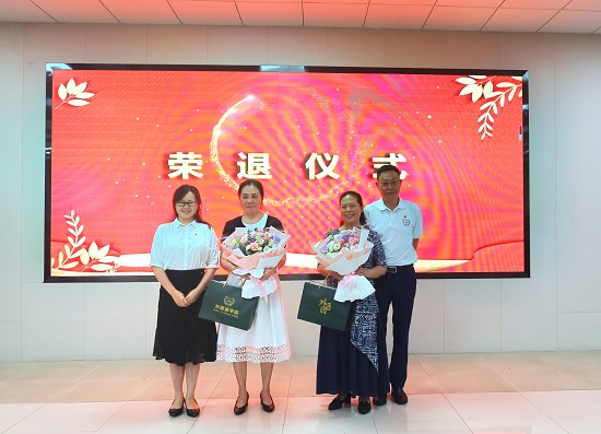 第一个环节,对两位即将退休的教师进行荣退仪式,周幸老师和邓小秋老师分别作荣退感言,学院党委书记文丽丽和段胜峰院长上台发言并送祝福。