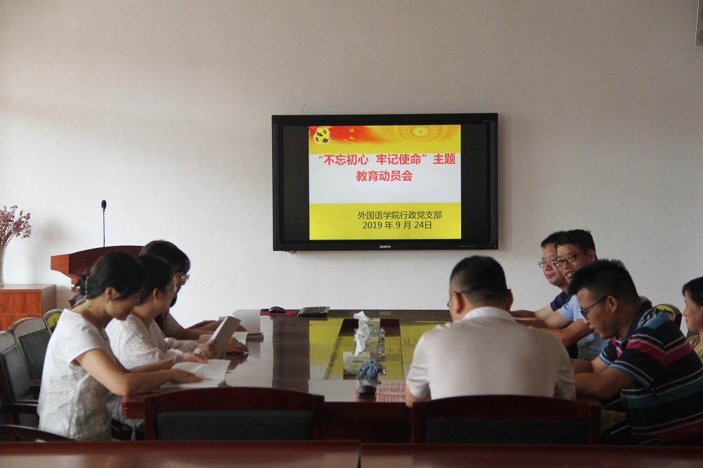 9月24日下午外国语学院教工三个党支部在各自党员活动室召开了党员大会,传达中央、省委、学校和学院“不忘初心、牢记使命”主题教育工作会议精神。会议由各支部书记主持,支部全体党员参加。