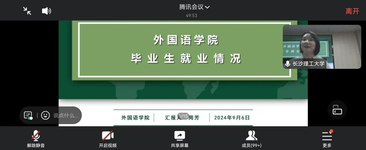为全面贯彻落实党中央、国务院关于高校毕业生就业工作的决策部署,推动毕业生高质量就业,外国语学院于2024年9月6日(周五)下午19:00召开2025届毕业生就业动员大会暨家校沟通会,指导帮助2025届外语学子了解就业形势,以更加积极的态度、更加扎实的技能、更加坚韧的意志,去迎接未来的挑战。学院党委书记文丽丽、院长段胜峰、党委副书记周芳出席本次大会,会议由就业专干武巧琳主持。全体 2025 届本科和研究生毕业生在三教321报告厅参加会议,毕业生家长通过线上腾讯会议收看现场直播。