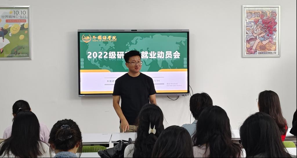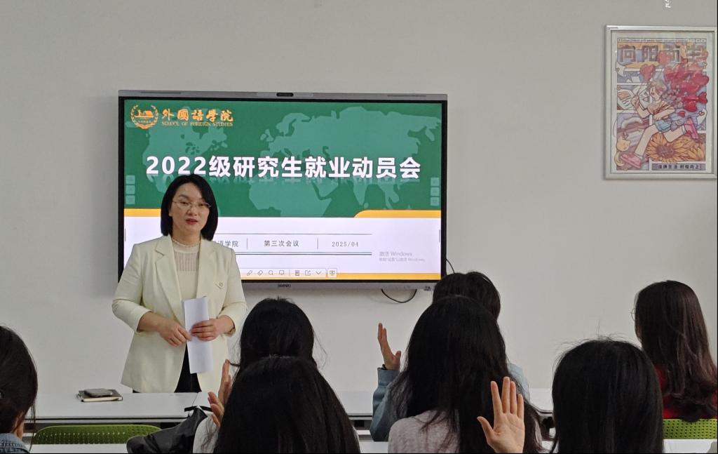 为积极应对严峻就业形势,引导25届毕业研究生树立正确的就业观念,鼓励同学们积极就业。4月22日上午10:00,外国语学院组织召开2022级研究生就业动员会,院党委副书记周芳、就业专干武巧琳、研究生辅导员郭恒及2022级全体研究生共同参会,会议由郭恒主持。
