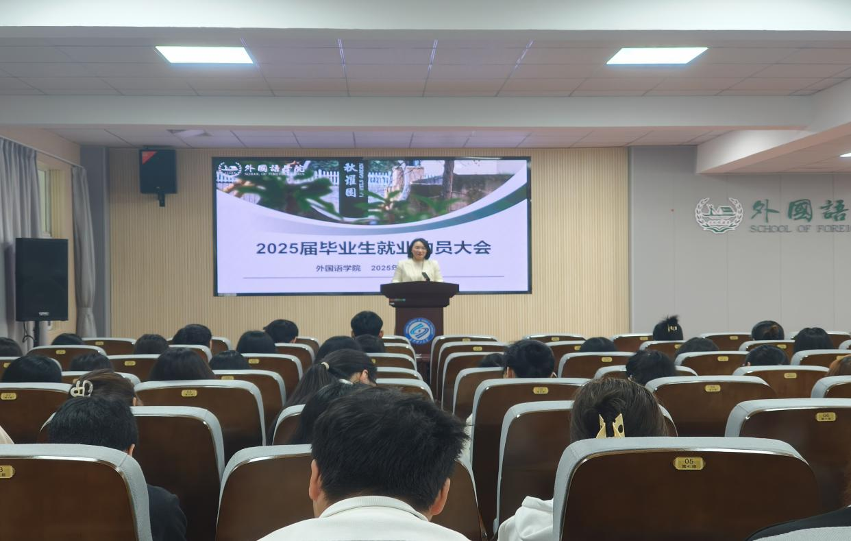 2025年4月22日上午11点,外国语学院在3教321报告厅召开了毕业生动员大会。本次动员大会由学院党委副书记周芳主讲,旨在帮助毕业生分析就业形势,鼓励毕业生以积极的心态进行求职和择业。