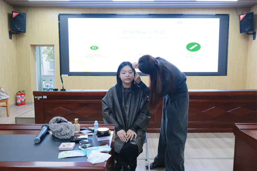训练营重点围绕“求职形象打造”展开系统培训。心田花开人力资源部张芊老师和刘璟仪老师从职场着装规范、仪态管理到职业妆容设计,为同学们提供了全方位的形象指导。现场特别设置了体验式化妆教学环节,通过实操演示,帮助同学们掌握符合职场要求的妆容技巧。