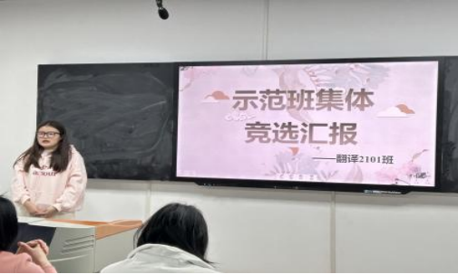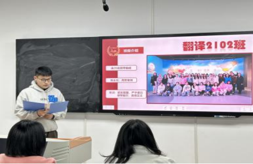 会议共分为三个部分,第一部分为翻译2102班,翻译2201班,翻译2101班班长分别进行班级竞选表述。三位班长分别从党团建设、学风建设、组织建设等方面陈述班级竞选理由,表述清晰有力。