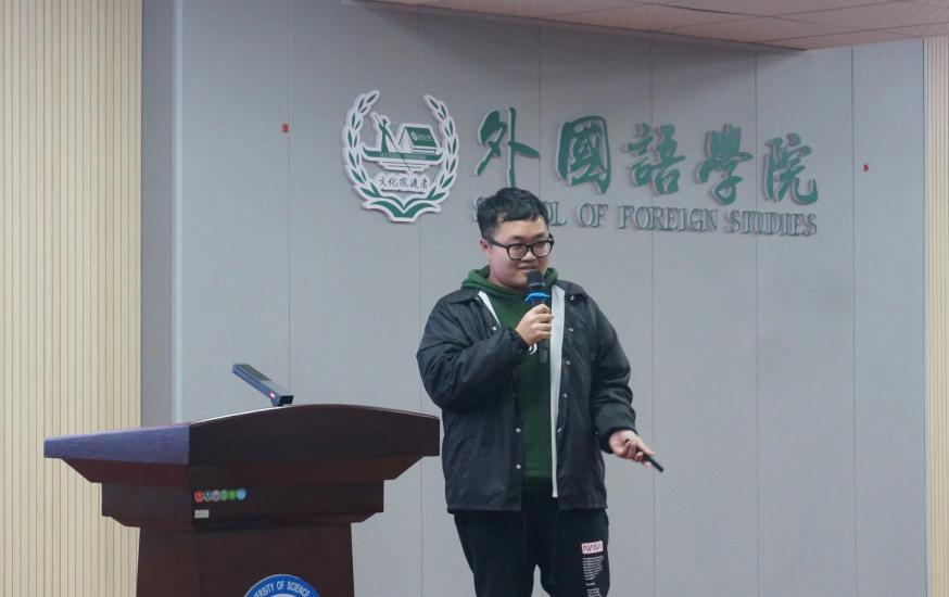 已保研至上海外国语大学的刘欣阳在经验座谈会上分享了他的学科竞赛、翻译考证和实践经验。首先,他和同学们分享了他的大学经历,从确立目标、初识口译的大一,在演讲比赛中不断进步的大二到演讲与口译同步推进的大三再到保研上外、从选手转变为专业比赛主持的大四,刘欣阳说道:“我们需要具备初生牛犊不怕虎的勇气,勇于尝试,勤加练习,放下得失心和害怕辜负的负担,享受赛场和学习。”