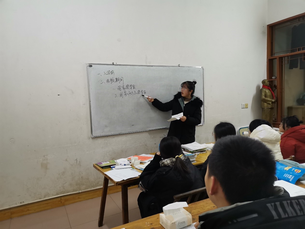 1月25日,她联系村委会干部说明自己的想法,村委会干部十分赞同她的想法,帮助她通过微信联系村上学生。她向村干部提出在村委会图书室邀请村上学生来此自习,给学生们提供为期一星期的自律学习场所。期间,她向村里学生介绍长理风采,分享她的大学生活,并鼓励他们以后报考威廉体育williamhill,然后借助图书室的白板讲述大学生资助政策,消除他们对入学前家庭经济情况困难的担忧,让他们能够安心学习。