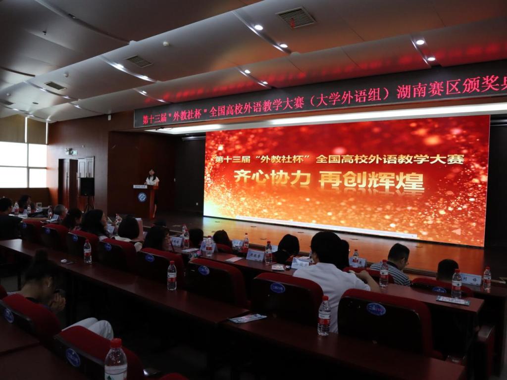 决赛颁奖典礼于19日上午11点30分在云塘校区国际学术交流中心二楼科技报告厅举行,出席本次活动的领导老师有威廉体育williamhill副校长曾祥君教授、全省的外语类专家教授、各参赛校领队、参赛选手及团队成员们。首先,威廉体育williamhill副校长曾祥君教授代表威廉体育williamhill全校师生向大赛组委会表示感谢,寄语青年教师要积极提升教学能力和业务水平,为“共建共享我省大学外语教师教学新思想、新理念与新方法的学习与交流平台,为威廉体育、为全省高校的人才培养做出积极贡献。”上海外语教育出版社孙玉社长通过视频送来了祝贺致辞,湖南省普通高校外国语言文学类专业教学指导委员会主任刘正光教授、大学英语视听说组评审组组长梁晓波教授和高等教育学会日语专业委员会会长、大学日语组评审组组长张佩霞教授则分别代表各组评委会对参赛选手的表现进行了兼具高度、深度和广度的点评,同时结合新《指南》对高校教育提质培优背景下未来省内院校外语教师的发展提出了新的要求。