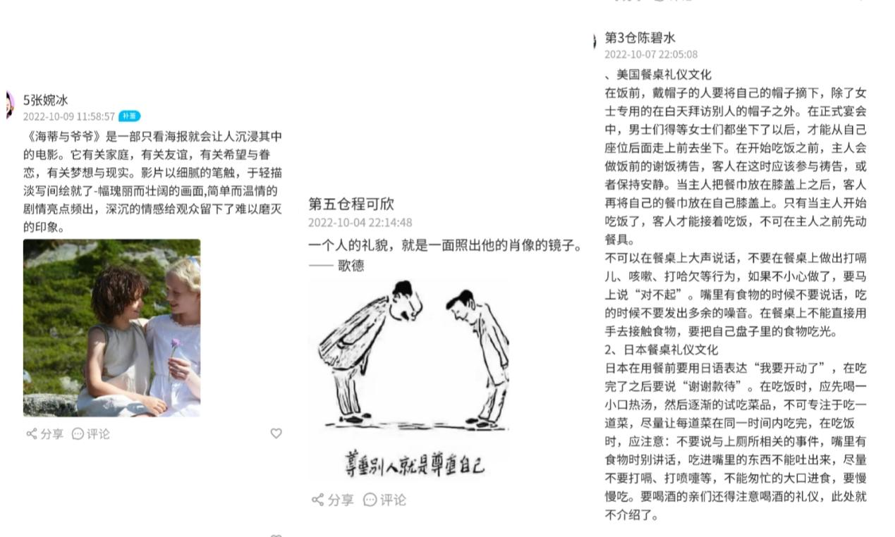 正如董卿所说:“气质是一种味道,腹有诗书气自华。品格也是一种味道,出淤泥而不染濯清涟而不妖。”美感来自人外在的体现,更来自人们的内心。第二周读诗分享主题,学员们自主配对报名,伴随着音乐进行朗诵,用诗歌展现大学生激昂的青春和灼灼爱国之情,并在明信片上写下感悟,相互交换以便分享训练成果,共同交流学习。敢于展示,敢于分享,敢于表达是一切的开始,此次活动充分调动了学员的积极性,配合线上打卡的形式,让每一位同学都参与其中。