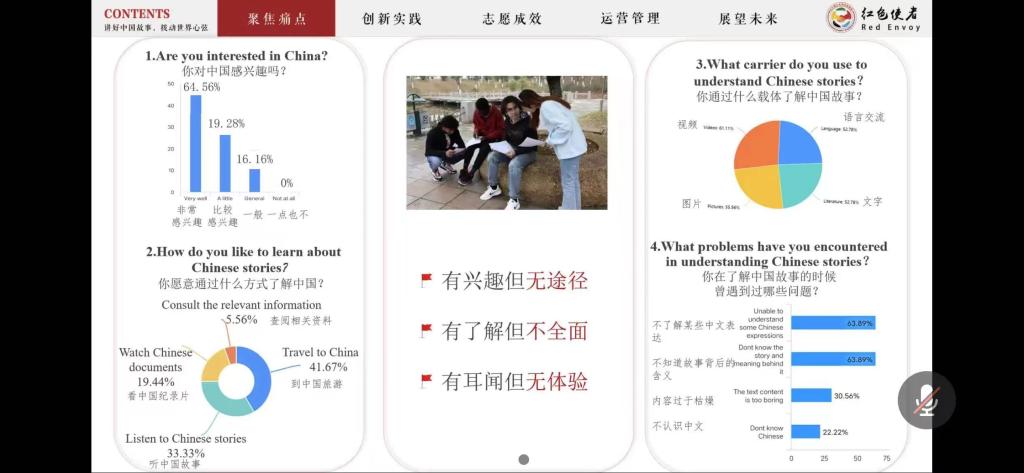 在比赛过程中,各团队充分利用5分钟答辩时间,立足实践创新,注重团队协作,谋求学科知识交叉应用,向与会人员充分展示项目内容,并接受评委老师的点评。本次比赛在经过层层筛选后,共有3个团队脱颖而出,推荐参与校级评选。“YAYA学语——陪伴孩子与世界好好沟通”,“YAYA学语”音同“牙牙学语”,意思为婴儿咿咿呀呀地学大人说话,寓意着致力于语言事业,服务于儿童教育之意。“学语”代表儿童对语言教育的需要,通过“与世界沟通”,让适龄儿童从世界各个地域文化中体会不同的风土人情从而获取语言能力,致力于成为中国语言素质教育公益组织创新者与推动者。“‘遗湘’情愿——湘货跨境电商销售”,立足于优秀湖湘非遗文化,在“互联网+”的大背景下,通过与企业的合作,采取跨境直播的方式,选择具有湖湘特色文化性质的文创产品推广至国外。“红色使者”翻译团项目团队致力于以语言作桥梁,以中国优秀文化为内容,助力发出中国“最强音”。项目团队结合已有的调查数据与已开展的实践活动,创新构建“R-E-D”模式,充分利用图书、新媒体、体系化课堂、实践等多样化载体及志愿者团队、国际孔子学院合作资源,深化其对中国故事的理解,向世界传播真实的中国文化,刷新世界对于中国的错误认知与刻板印象,让世界切实感受到中国力量与其背后所蕴含的深厚文化底蕴。