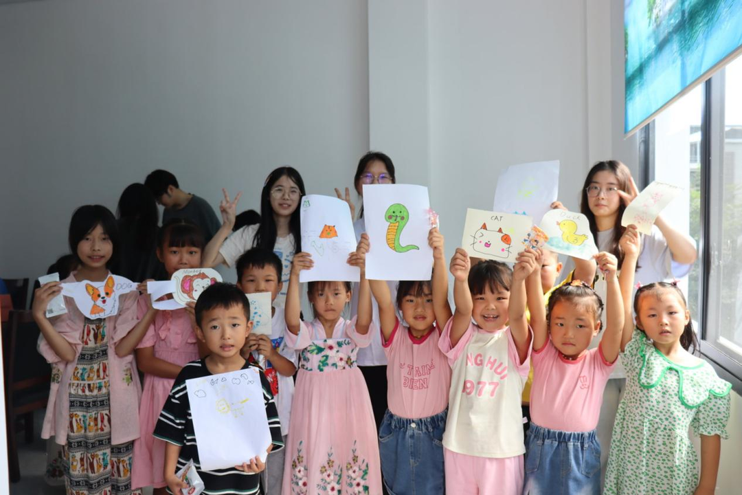 团队成员小谢老师头戴老虎面具,用有趣的故事将孩子们带入一个精彩的森林之王竞选会中,引出教学主题——学习小动物的英文表述。孩子们认真好奇地听着老师讲课,积极地参加每一个活动。在绘图环节,志愿者们走到孩子们的身边,耐心询问他们喜欢的动物,引导他们动手将心中所想绘制出来,告诉他们相对应的英语单词,帮助孩子们用具象化的画面理解单词含义。