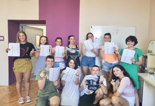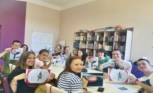 (女书文化课结束后,欧洲黑山大学孔子学院的学生们手持女书书写表合影)
