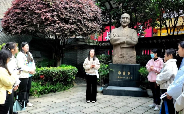 进入院内,绿树林下立着李富春半身石雕像,一身笔挺中山装,神采飞扬。再往里走,李富春的优秀事迹依次展开。从“杰出的无产阶级革命家”到“社会主义经济建设的奠基人”,再到“永葆本色的人民公仆”,同学们全方位了解了李富春“坚定信念跟党走”的革命本色,深刻领会了他“公烛无私光”的奉献精神。