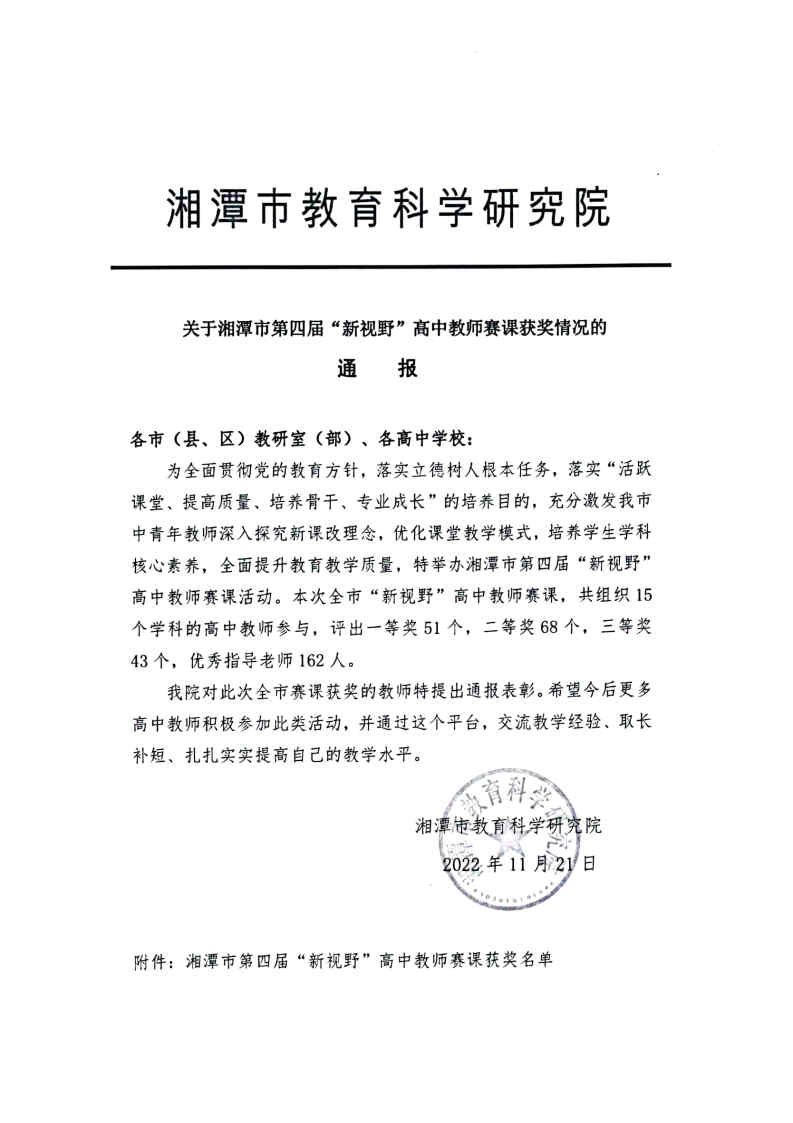 2022年11月,正在筹备湘潭市第四届高中教师“新视野”课堂教学比赛的湘潭县二中高中英语教学团队主动向威廉体育williamhill大学英语教学团队寻求帮助。两个团队在外国语学院黄坚副院长的全力支持和部署督促下,克服疫情不利影响,积极展开云端备赛交流,相互交流课程思政教学理念,深入探讨思政元素挖掘,明晰 “知识传授、技能培养和价值引领”三位一体的教学目标,综合应用教学支架、任务驱动、小组合作探究等教学方法,打磨优化参赛教学设计和教学展示,为高中英语课程思政实践教学和竞赛设计提供全新视角。