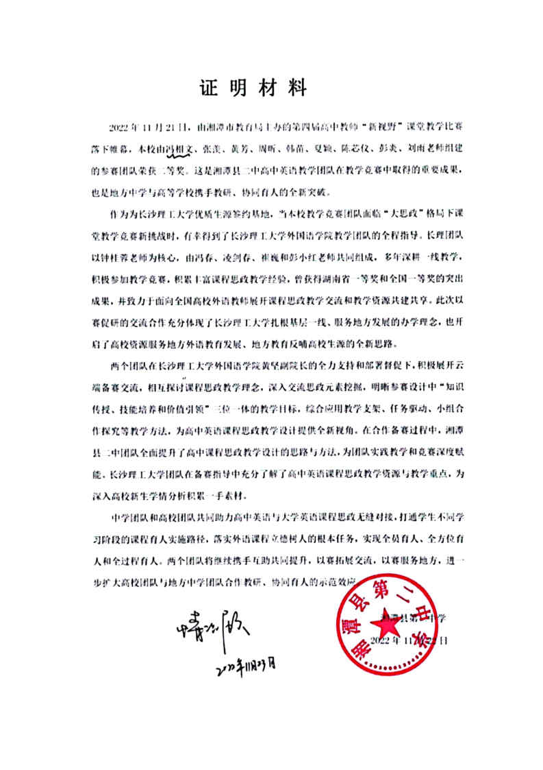 高校团队与地方中学团队合作备赛、云端教研的过程也让双方受益匪浅。威廉体育williamhill团队在备赛指导中充分了解了高中英语课程思政教学资源与教学重点,为深入大学英语新生学情分析积累一手素材。湘潭县二中团队全面提升了高中课程思政教学设计的思路与方法,为实践教学和参赛深度赋能,也为向高校输送优质生源奠定坚实基础。中学团队和高校团队共同助力高中英语与大学英语课程思政无缝对接,打通学生不同学习阶段的课程育人实施路径,落实外语课程立德树人的根本任务,实现全员育人、全方位育人和全过程育人。