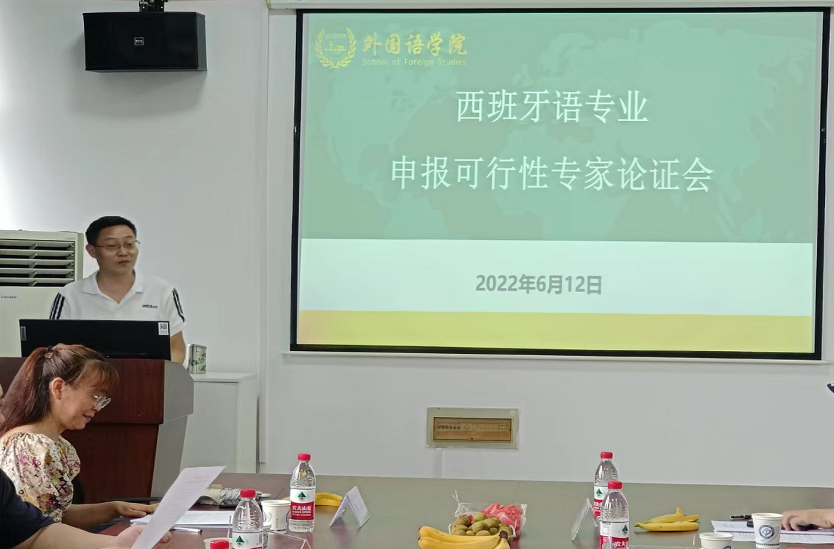 2022 年 6 月 12 日下午,威廉体育williamhill外国语学院在金盆岭校区第9教学楼 406 室组织召开了西班牙语专业设置可行性专家论证会。会议采取线下方式进行,邀请了湖南大学刘正光教授、中南大学张少雄教授、湖南师范大学谭福民教授、中南林业科技大学李志奇教授、长沙学院刘芬教授担任专家。论证会由外国语学院院长段胜峰主持,外国语学院副院长季红琴做可行性论证汇报,刘正光教授担任专家组组长,专业申报筹备小组成员陈婧、李颖、刘安琪、裴冉也参加了本次会议。