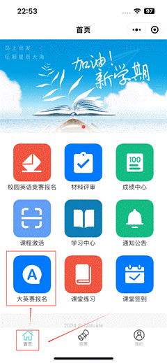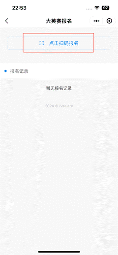 在“iValuate”小程序首页点击“大英赛报名”图标,进入报名界面。