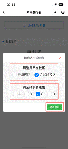 点击“点击扫码报名”按钮扫描报名负责人提供的二维码,成功之后会弹出“确认相关信息”的界面,选择好校区和类别之后点击“确认报名”按钮提交报名信息。此时在页面的“报名记录”下方可以看到一个标有“未确认”的报名记录。