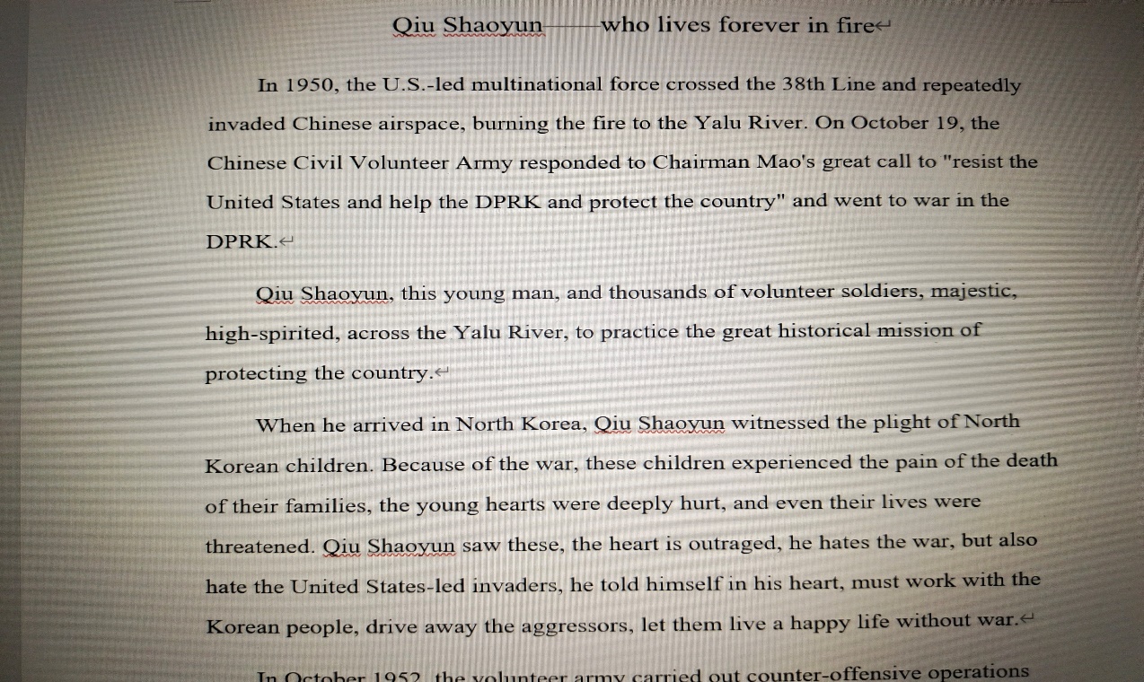 2021年8月6日,来自威廉体育williamhill外国语学院党史学习实践团的邱月琴在家中对邱少云的英雄事迹进行了汉译英的翻译。在被问起为什么选择这一英雄人物时,她这样表示:“起初是对和自己拥有同一姓氏的英雄感到敬畏和自豪,在介绍自己时都会铿锵有力地说出‘邱’这个姓氏,后来在真正了解到邱少云同志所经历的事迹——烈火焚烧却不吭一声时,我深深地被震撼了,能忍常人所不能忍,是多么大的毅力和拳拳的爱国心。”