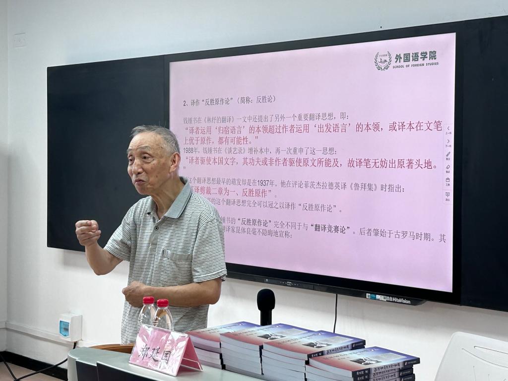 课堂上,郑教授悉心向同学们阐述了近代著名作家钱钟书先生恢弘磅礴的文学观,对钱钟书的“十六字真言”——“东海西海,心理攸同,南学北学,道术未裂”进行了解读,并用具体的例子分别论述了钱钟书的翻译两论,即翻译“化境”论以及译作“反胜原作”论。“俗话说,人生分四阶,问学在四季,一日有四时,三者各有其时,求学其间,四季自有花开,自有果落。亲爱的同学们一定要在最好的时光、最美的校园好好享受读书的滋味。也希望同学们能够认真学习和研究钱钟书的学术理念和翻译两论,并以钱钟书为榜样,刻苦努力地进行翻译实践,且使自己的译作达到‘化境’,甚至能够‘反胜原作’!”郑教授以讲解赏析钱钟书的译文为契机,为同学们寄语道。