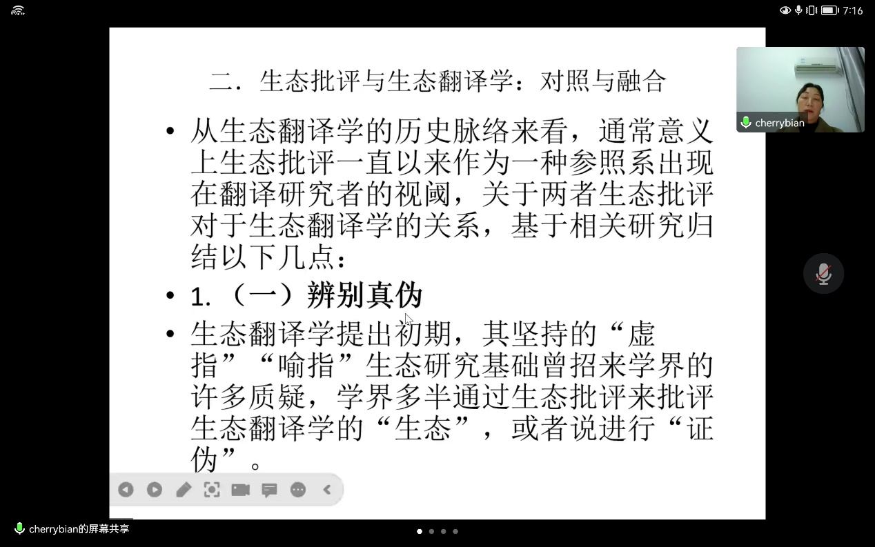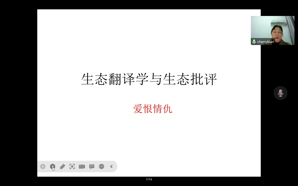2022年12月14日晚,我院边立红副教授应邀为威廉体育第十八届博力学术论坛“翻译生态与生态翻译”专题论坛做了题为“谈谈翻译的自然维度”的讲座。外国语学院部分导师及全体研究生参加了本次讲座。