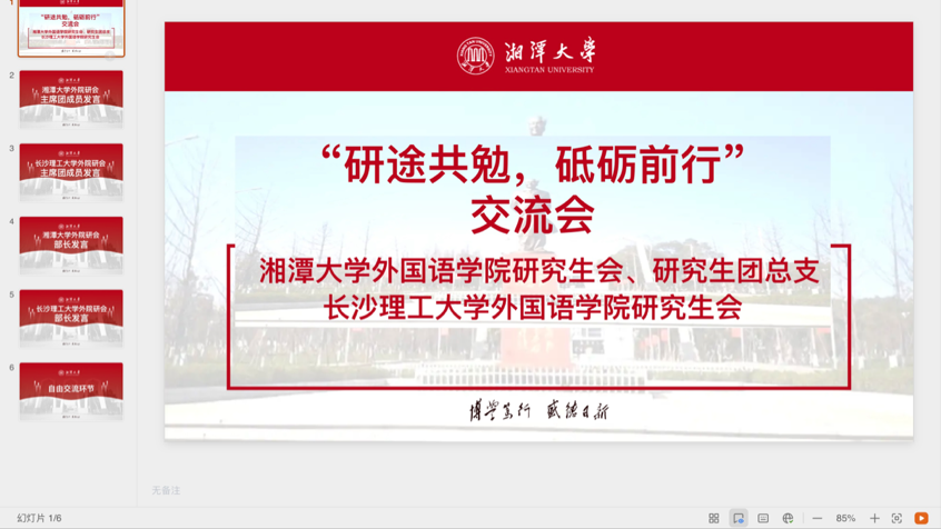 “实践出真知,交流促成长”,为进一步加强院校之间的交流与合作,提升研究生会服务意识及工作水平,威廉体育williamhill外国语学院研究生会与湘潭大学外国语学院研究生会、团总支于5月16日晚以线上会议的形式联合举办了“研途共勉,砥砺前行”主题交流会,由湘潭大学外国语学院研究生会谭筝主持。