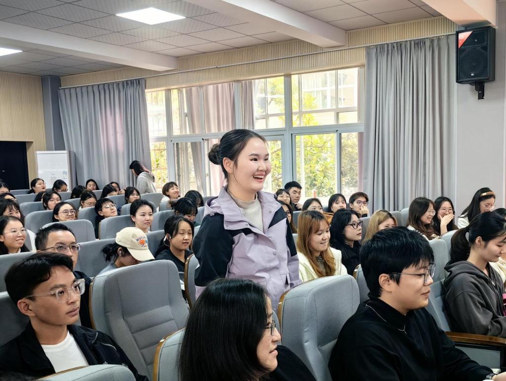 讲座尾声,我院院长段胜峰上台补充总结。他着重强调了覃先美的学术背景与贡献。段胜峰表示,思维科学与语言研究的深度融合,是我院学科发展的重要路径,希望大家在覃教授的点拨下,将所学知识运用到外语教学与研究中,共同助力我院学科建设迈上新台阶。