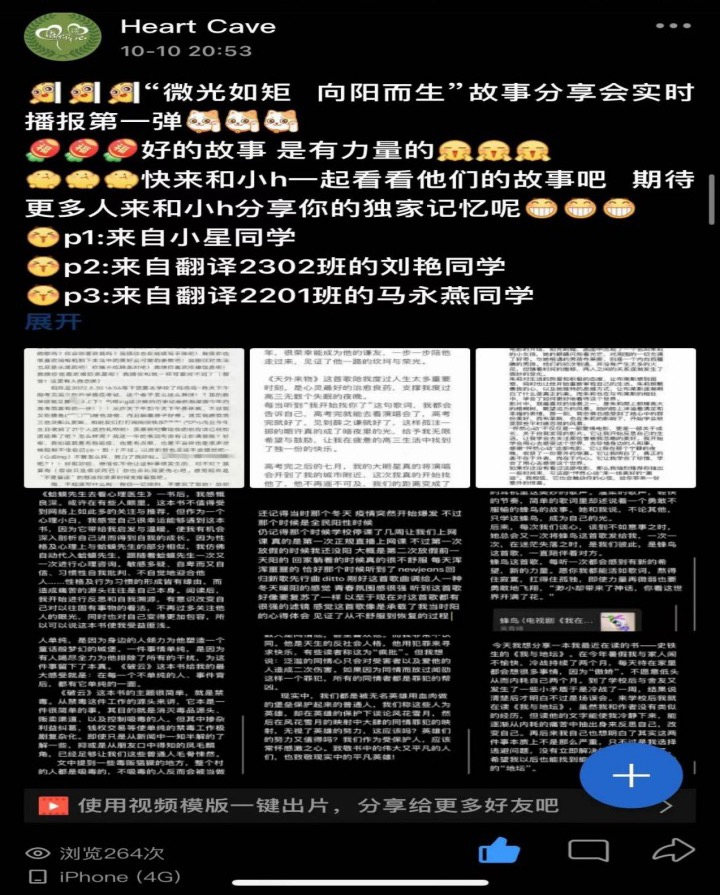 线上“心灵树洞”故事分享活动共收到62份投稿,同学们将自己的故事发送至朋辈心理互助部官q,并由工作人员精选部分故事在qq空间进行实时分享。有同学借歌曲抒发情感,表达了对妈妈的思念,将平时难以表达的感情化成文字吐露而出;有同学通过品读名家的作品审视自我,对自己有了一个更加深刻的了解;有同学推荐备受好评的电影,分享自己对青春和生活的感悟;有谦友写下她与《天外来物》的故事,记录下青春最纯真的梦想。大家分享故事的同时也从故事中汲取力量,以自己现在的视角重新赋予这些故事新的意义。同学们不止将故事讲给“心灵树洞”听,更讲给自己听,讲给大家听,让爱与美好流传在大家心中。