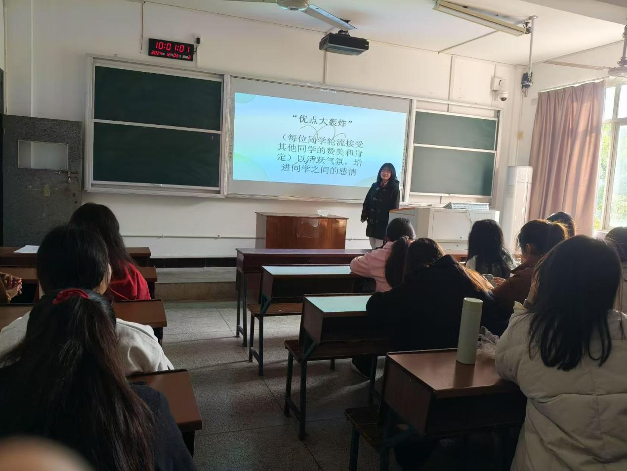 活动伊始,各班心理委员围绕常见的学习压力、人际关系处理以及自我认知等话题,结合生活实例,与同学们展开讨论。同学们积极参与,纷纷分享自己在学习和生活中的经历和感受,现场气氛热烈而融洽。各班心理委员还结合活动中的重点,开展各有特色的素质拓展环节。翻译2301班的“优点大轰炸”每位同学轮流接受其他同学的赞美和肯定,英语2302班的“大风吹”拉进了同学们之间的沟通距离,环节的巧妙设置让活动效果得到了保证。在自由交流环节,同学们谈论自己的成长经历、兴趣爱好、职业规划等等,打造了积极向上的学风和团结友爱的班风。