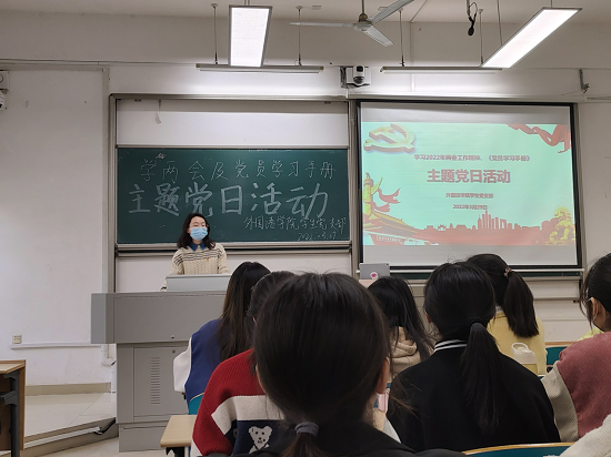 2022年3月29日下午,学院本科生翻译党支部和英语党支部在文科楼A205开展3月份党支部主题党日活动,组织学习2022年全国两会工作精神和《党员学习手册》。活动由翻译党支部委员冯雨霁同志主持。学院党委副书记王双和本科生党支部全体党员参加活动。
