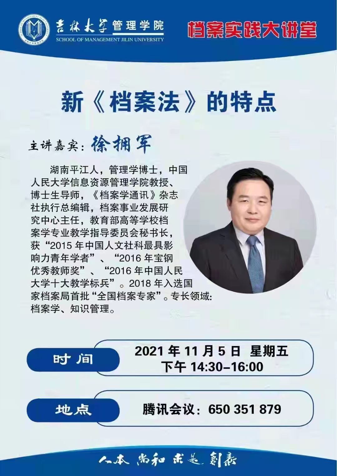 11月5日下午,中国人民大学信息资源管理学院徐拥军教授通过腾讯会议平台做了“新《档案法》的特点”的专题讲座,档案馆组织全体职工在线聆听。