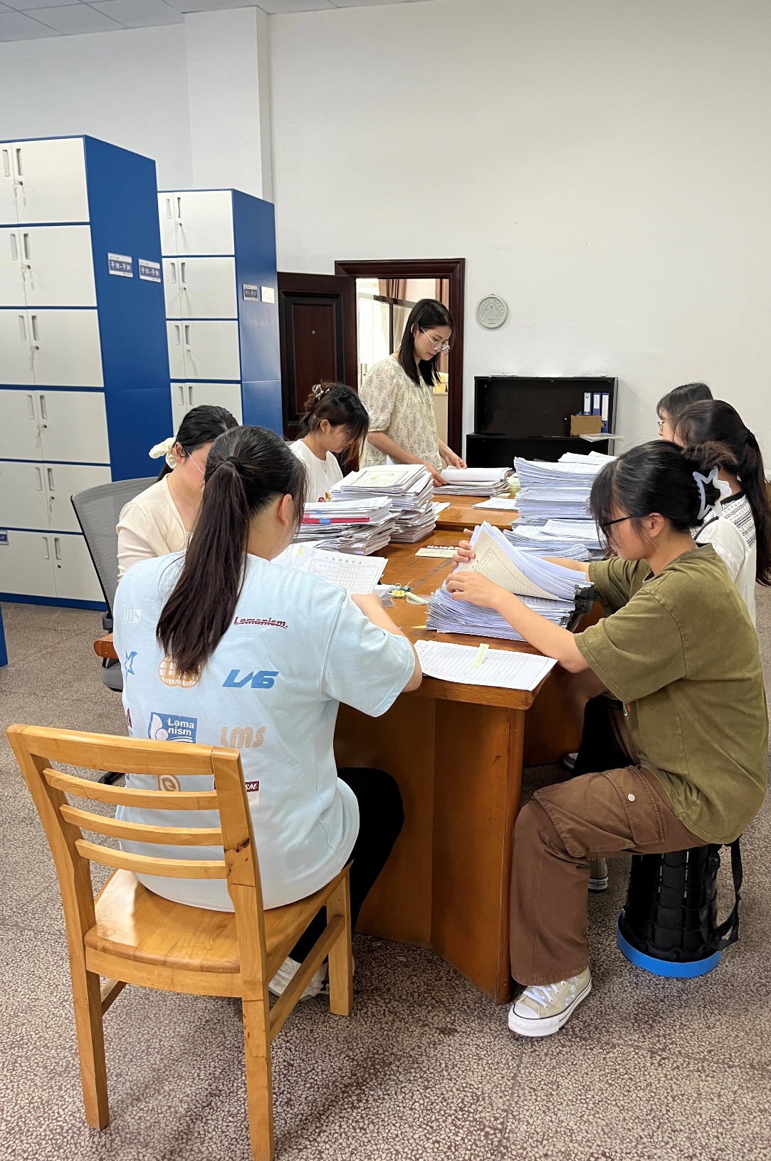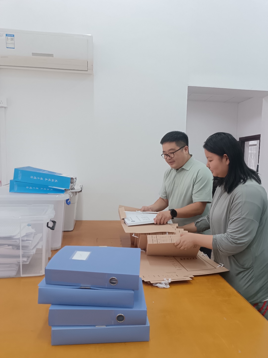 在李满艳副主任的指导下,第一组8名同学承担起人事档案甄别进档工作。从最基础的材料分类起步,同学们亲身体验了档案工作核验与整理所需的细致、耐心与严谨。熟悉操作规范后,同学们两人一组协同作业,高效完成人事档案的材料录入、信息核校、编号建档、分类排序、归档保存等全流程标准化操作。