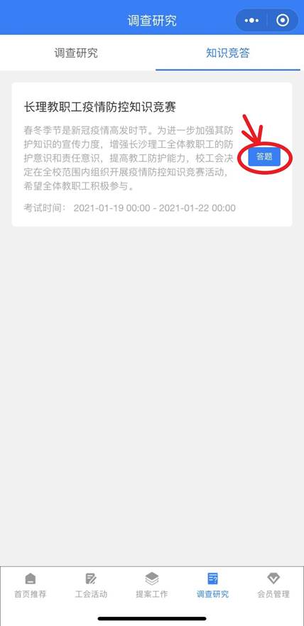 第三步:点击下方菜单栏中“调查研究”按钮,再次点击“知识竞答”按钮