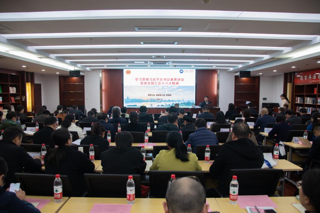 为深入学习贯彻习近平总书记关于工人阶级和工会工作的重要论述和中国工会十八大精神,把学习贯彻习近平新时代中国特色社会主义思想主题教育成果转化为凝心聚力共建“百强”的奋斗力量,推进工会工作高质量发展,12月5日,校工会在云影文化传播中心举办2023年度工会干部培训班。本次培训工作得到了上级工会的大力支持,省总工会党组成员、省教育工会主席刘湘凌,省总工会基层工作部二级调研员邓三成出席会议并作专题讲座,校党委副书记刘建民出席开班仪式并讲话,校工会委员会委员、各分工会干部、校工会专职干部等100余人参加了培训。培训由校工会常务副主席郭剑主持。