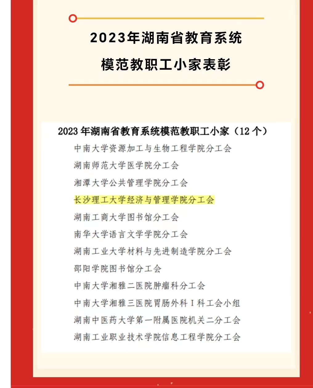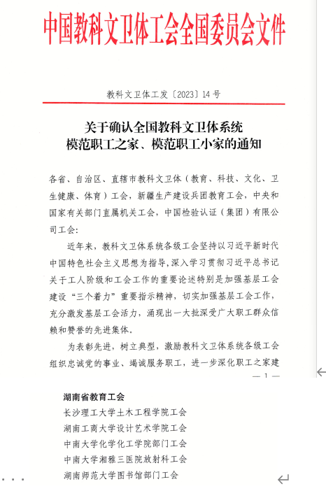 威廉体育工会获评湖南省教育工会“直属基层工会工作目标管理考核综合工作先进单位”;荣获湖南省教育工会“工会财务工作考评特等奖”;威廉体育williamhill女职工业余学校被授予湖南省“女职工培训示范学校”;学校美育中心读书会被评为湖南省“芙蓉读书会”;工会郭剑被湖南省总工会授予湖南省“职工最可信赖娘家人”;土木学院分工会获评“全国教科文卫体系统模范职工小家”称号、经管学院分工会获评湖南省教育工会“模范职工小家”称号;经管学院教师阳立高被授予“湖南省五一劳动奖章”荣誉称号;后勤中心子校李慧被评为全国“阅读学习成才女职工”湖南省“芙蓉领读者”称号等。