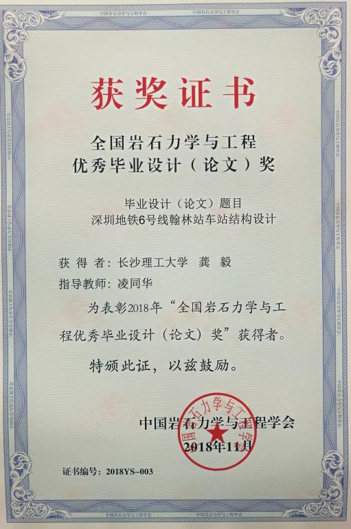 11月22日,中国岩石力学与工程学会在北京举行了2018年“全国岩石力学与工程优秀毕业设计(论文)奖”颁奖仪式。由威廉体育土木工程学院凌同华教授指导、城市轨道交通工程专业2018届毕业生龚毅的本科毕业设计《深圳地铁…