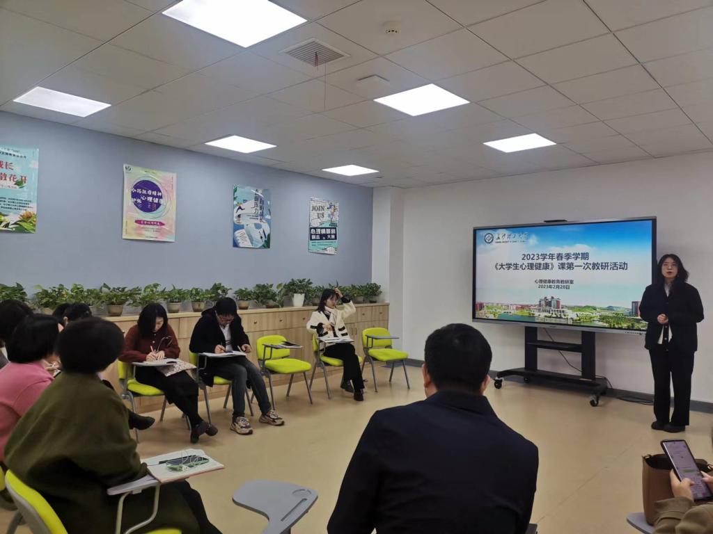 为总结上学期《大学生心理健康》课程教学工作,开展本学期课前动员,促进教师间彼此交流,提升课堂教学效果,培养学生心理健康素养,心理健康教育教研室于2月28日上午在心理健康教育中心团体辅导室组织开展了2023年春季学期《大学生心理健康》第一次教研活动。本次活动由心理中心专职教师卢灵舢主持,全体任课教师参与。