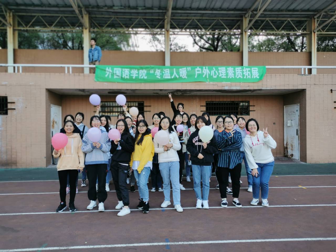 2019年11月19日下午,外国语学院朋辈心理互助部于金盆岭校区田径场举办了2019级新生户外心理素质拓展活动。本次拓展活动的主题为“冬温人暖”,有助于提高同学们的团队精神和合作意识,丰富同学们的课外生活。