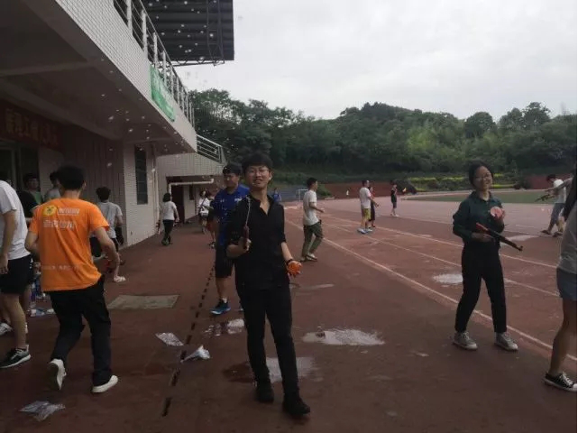 每名参与者配备水枪,披好雨衣,互相喷水,不作比赛,只为开心。
