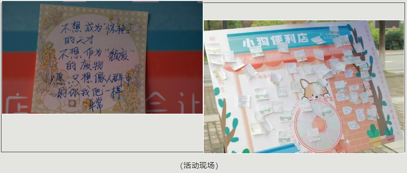 “狗便利店”--我们还为对文字更敏感的同学提供了本活动,或书写酸楚成长的经历,或书写自己酸楚成长的经历,或讲述身边双相患者的故事,或留下对患者朋友们鼓励支持的话语。“好好吃饭、好好治疗,加油!“展板上粘贴得满满当当表现了同学们的真心交互。