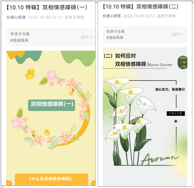 线上宣传方面,我们通过“长理心部落”微信公众号平台发送双相情感障碍等精神卫生知识,吸引了大量同学的关注和分享。