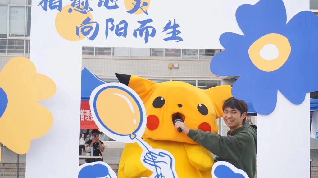 为吸引同学对精神卫生宣传周的关注,工作人员通过温暖的玩偶形象对同学们进行科普宣传,引导同学在本次活动的主题立牌前进行合影留念。