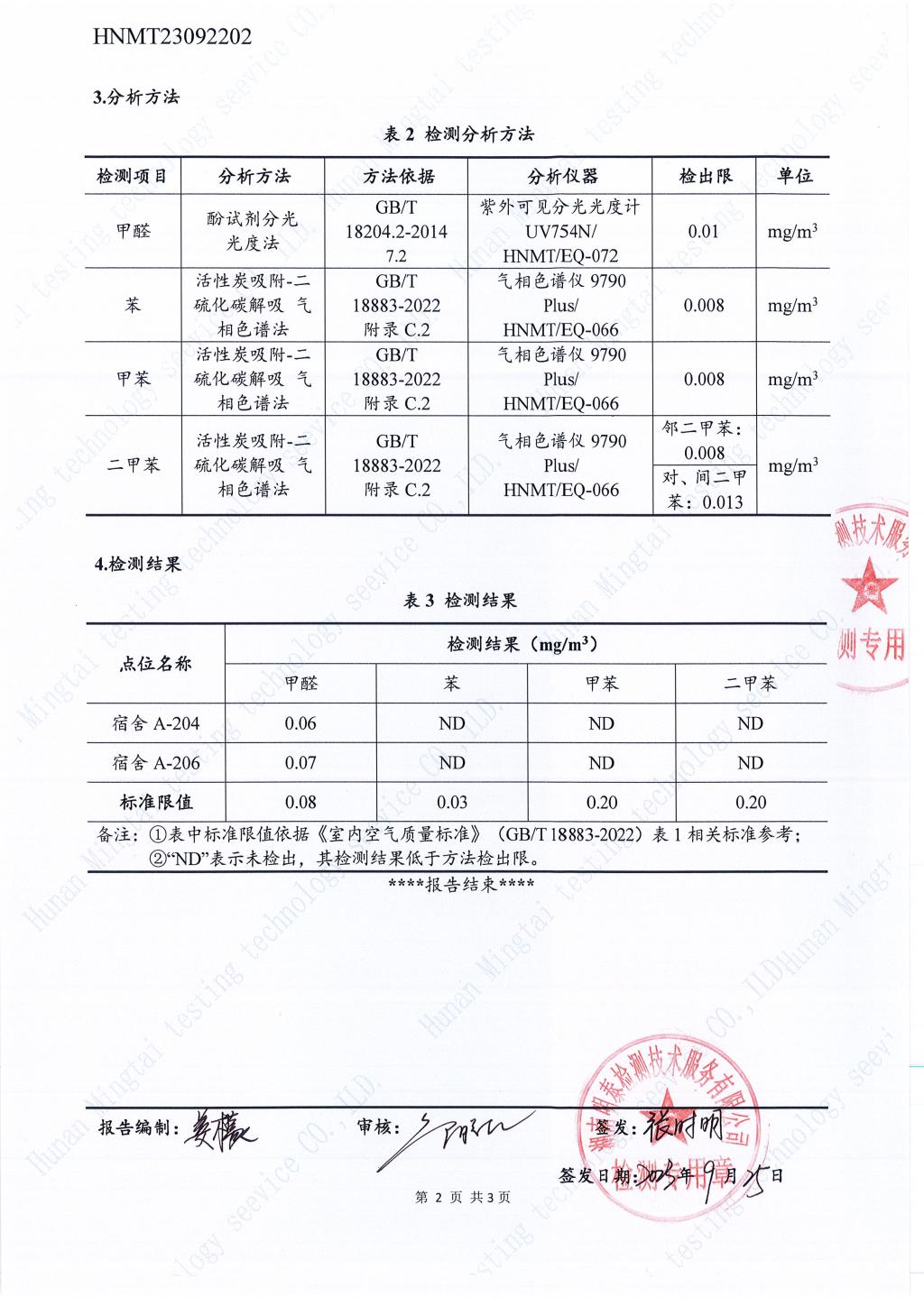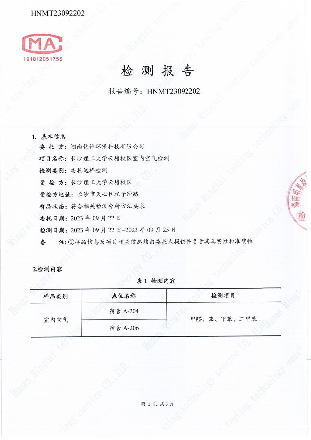 新建四期公寓3号栋(敏行轩3栋)A区空气质量检测报告