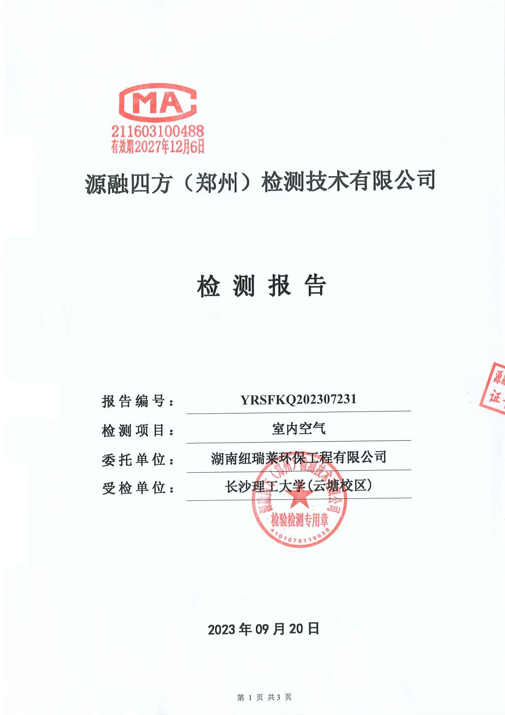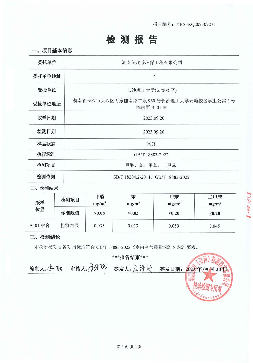 新建四期公寓3号栋(敏行轩3栋)B区空气质量检测报告