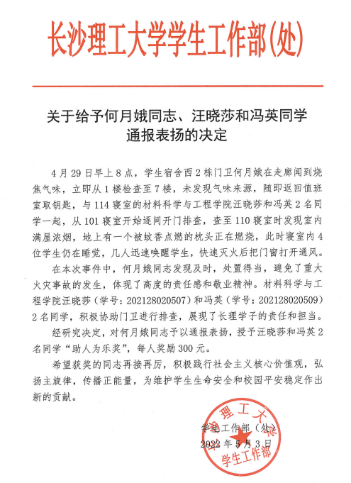 关于给予何月娥同志、汪晓莎和冯英同学通报表扬的决定