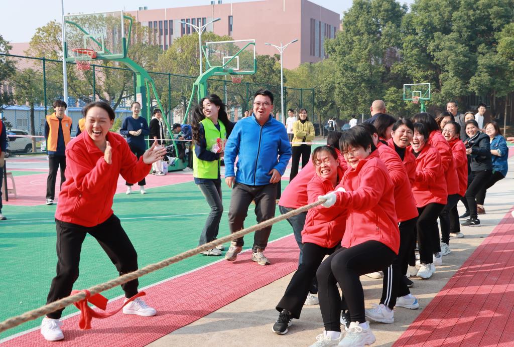 活动开幕式在主持人的热情介绍下拉开序幕,本次体育文化节涵盖了多项富有趣味的体育项目,拔河比赛、投掷沙包赛、呼啦圈接力赛、跳大绳比赛和齐步向前比赛依次进行,来自云塘校区四个园区的学生队伍和公寓中心的三支教职工队伍积极参与其中。比赛采用积分制,每个项目按照规则竞争前四名,根据排名记录相应小场积分,以最终五个项目的总积分决出前四名颁发奖品证书。比赛中更加注重团队的协同作战,融合了竞技性、游戏性、趣味性和智力性,内容形式多样,充分调动各参赛队的热情。