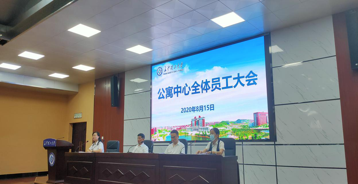 8月15日上午9点、下午3点,公寓中心在金盆岭校区四教报告厅、云塘校区综教B区104教室分别召开了2020年秋季学期工作布置及疫情防控消杀培训大会。会议分别由朱虹和柳联初主持,公寓中心全体员工参加。