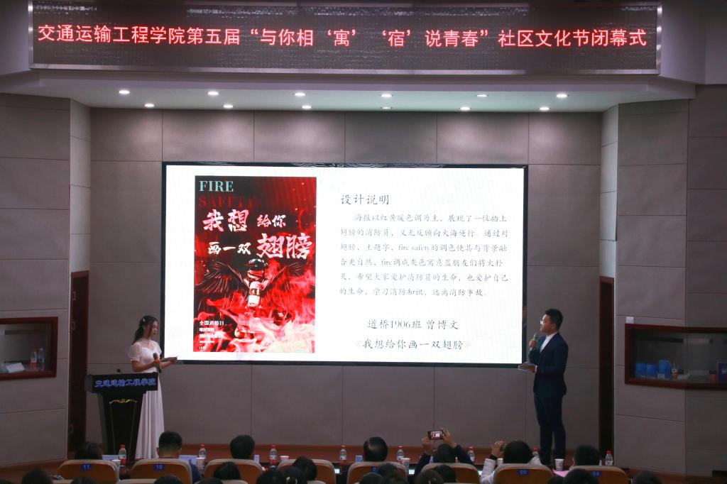 一封封纸短情长的书信,一段段精心制作的视频话剧,一张张搞笑幽默的表情包......近期,交通学院的同学们在社区文化节活动中“宿”说青春,分享着宿舍生活的点点滴滴,再现一个又一个奇思妙想。为进一步推动学生社区精神文明建设,深化寝室文化生活内涵,营造健康、活泼、文明、安全、幸福的社区氛围,交通学院于12月9日晚在云塘校区工科二号楼交通科技报告厅举办第五届“与你相‘寓’ ‘宿’说青春”社区文化节闭幕式活动。校关工委常务副主任王乃厚、学工部副部长王煜坤、交通学院党委副书记涂道勇、党建特邀组织员吴滨及学工办全体辅导员出席活动,交通学院第十五届团委学生会主要成员、参赛选手、各班生活委员等近两百人参加活动。