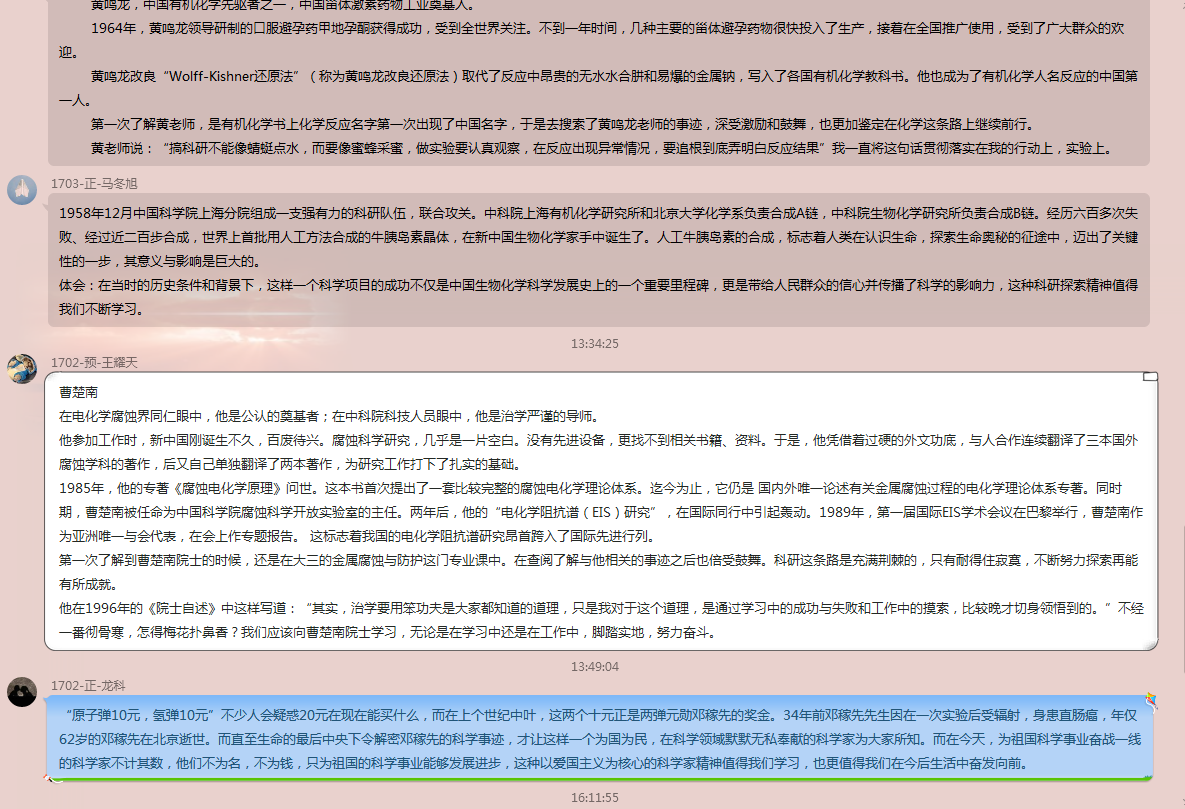 学生党员还结合专业特色开展四史学习,注重挖掘新中国发展史中原子弹制造等化学科技发展史。党员们线上讨论分享自己了解到的原子弹制造史、化学科技发展史,通过了解邓稼先等人突破苏联的技术封锁,从无到有,最后实现了第一颗原子弹爆炸成功。应化支部龙科指出,“通过这些知识的梳理,更近明白了新中国来之不易、如今的幸福生活来之不易,也更加坚定自己努力学习专业知识努力为我国科研事业做奉献的决心”。