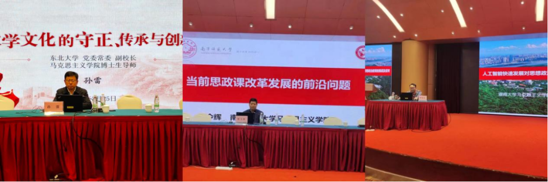 在主题报告环节,东北大学副校长孙雷教授以《大学文化的守正、传承与创新》为题,从“守正:回望过去,当悉大学文化来路;传承:着眼当下,当明大学文化使命;创新:放眼未来,当辟大学文化前路”三部分内容系统阐述了大学文化的历史发展和创新路径;南宁师范大学马克思主义学院院长曾令辉教授以《当前思政课改革发展的前沿问题》为题,聚焦“思政课本质”“大思政课”“思政课一体化”“课程思政”等四个关键词上,从理论和实践的视角提出破解之道,旨在推动思政课高质量发展;湖南大学教育科学研究院院长罗仲尤教授以《人工智能快速发展对思想政治教育的挑战》为题,指出了人工智能对思政课、教师教学能力以及对日常思想政治教育的载体和方式等方面的机遇和挑战,进而从主体、内容、载体、方法等角度提出了解决办法。
