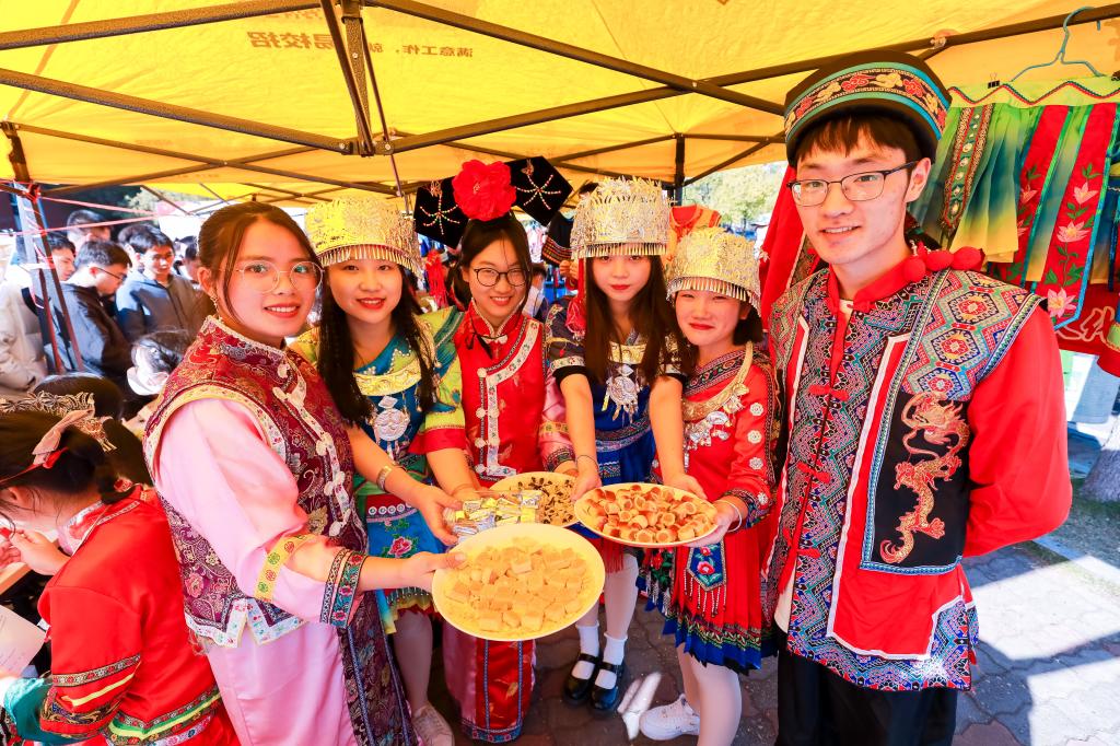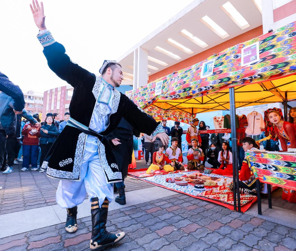 活动现场,师生以游园会的方式,在参观和享受民族文化饕餮盛宴的同时,切身感受各种做工精致的乐器所带来的唯美音色。苗族和土家族的民族村,帐篷前排着整齐的队伍,简单的服饰里藏着绝美独特的手工刺绣;侗族的特色卷饼,藏族的牦牛肉干、青稞,哈萨克族的塔米尔、熏马肠,维吾尔族的烤全羊、撒子以及各民族学生的民族服饰、挂毯、手工艺品、碉房等,都展现了各自浓厚的民族风采,也让各族学生感受到不一样的民族文化。