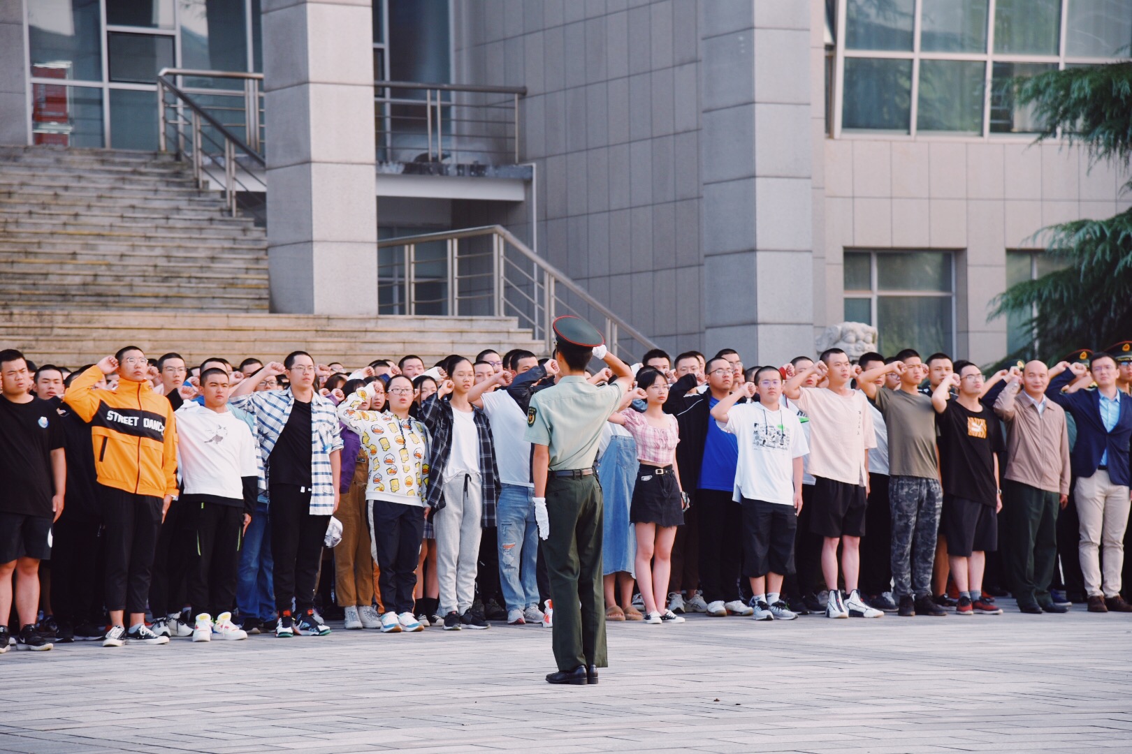 6点55分,升国旗仪式正式开始,随着指挥员下达出旗口令,国旗班护旗方队迎着朝霞,迈着坚实雄健、整齐划一的步伐,护送国旗走向升旗台。伴随着雄壮的国歌声,鲜艳的五星红旗冉冉升起,迎风飘扬。全体师生面向国旗行注目礼,齐声高唱国歌,向伟大的祖国致以节日的祝福和崇高的敬意。